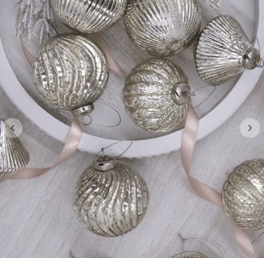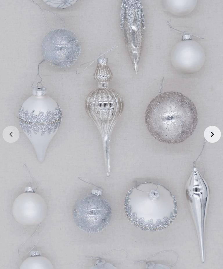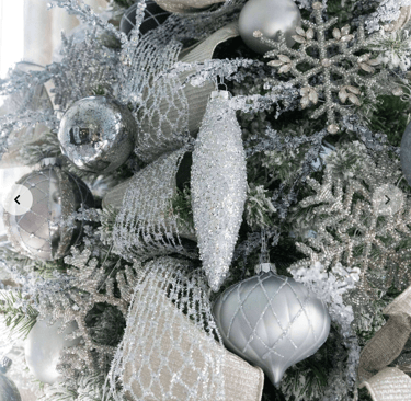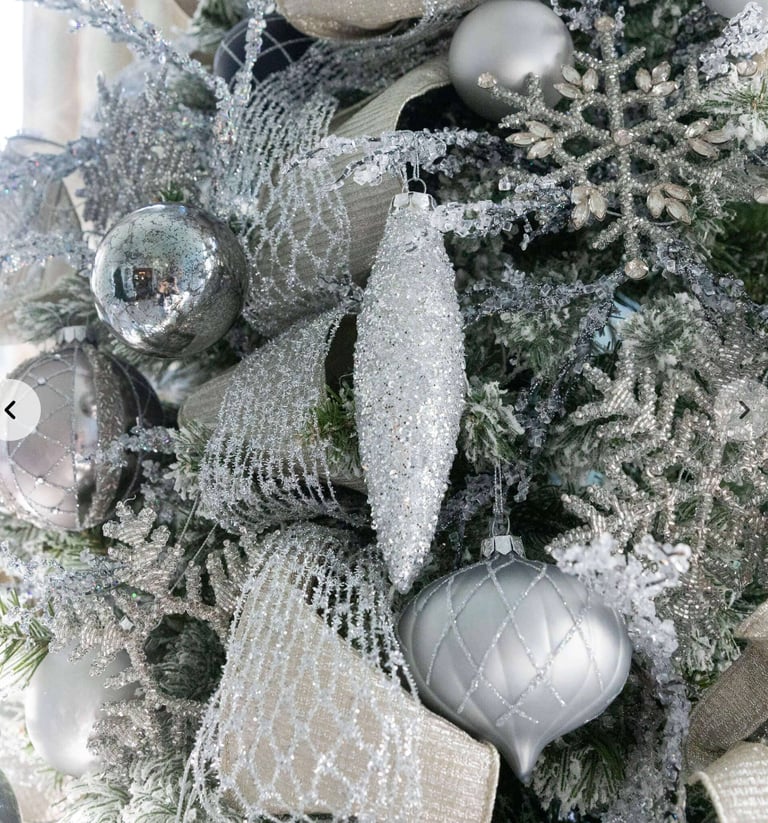 To help you build that perfect look, I’ve rounded up my favorite finds: the Winter Frost 15-Piece Glass Ornament Set (White-Silver), the Silver Frosted Ornament Set (6 Pack), the Silver Twists Glass Ornament Set (6 Pack), the Silver Accents Glass Ornament Set (12 Pack), and of course, the Netted Stretch Ribbon (10 yards) that ties everything together. These pieces shimmer, glisten, and layer beautifully—giving your tree that editorial, “designer-approved” finish without the effort.